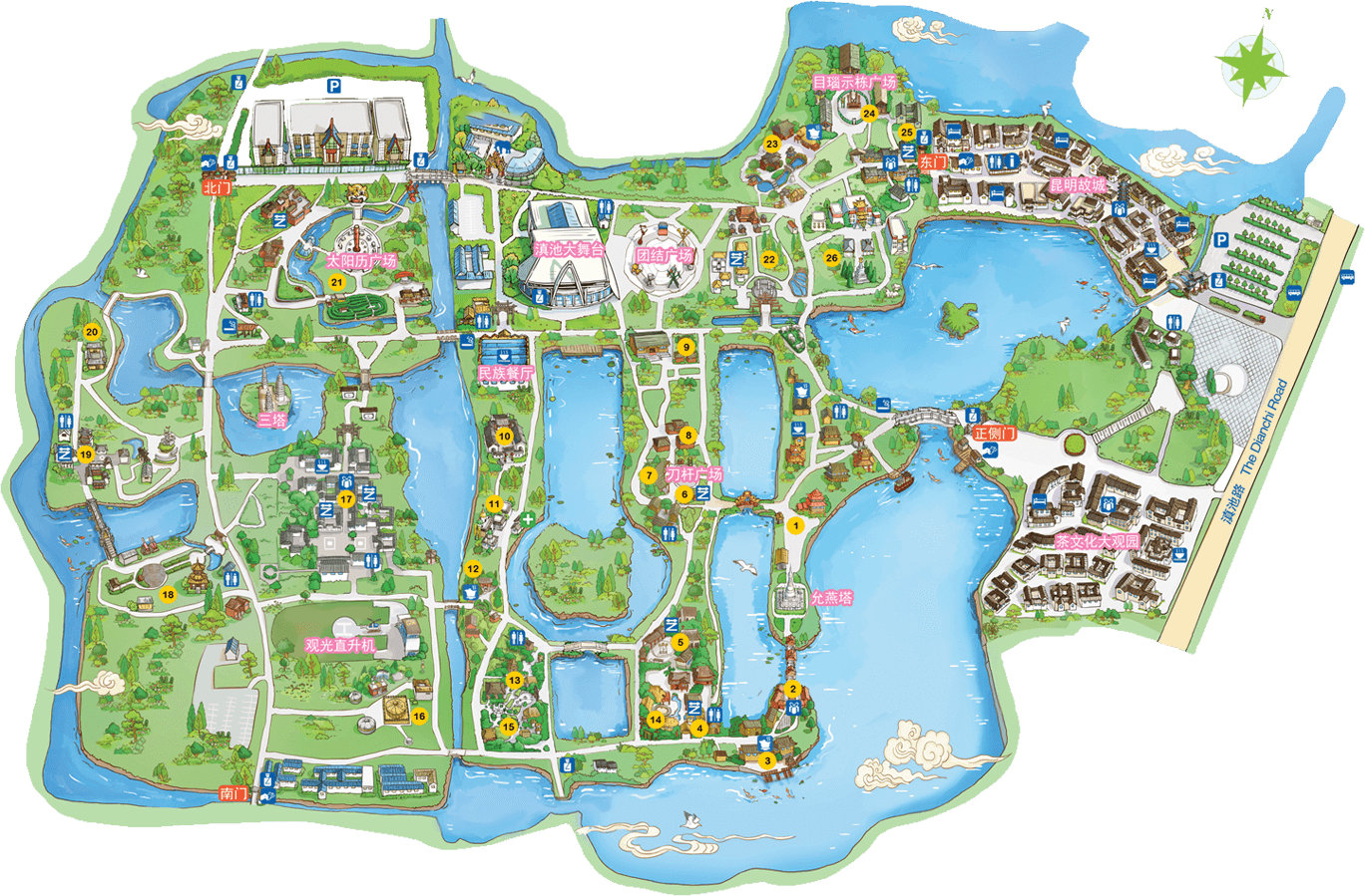 傣族人口約107萬(wàn)人,主要分布在云南的德宏傣族景頗族自治州、西雙版納傣族自治州及瀾滄江流域的河谷壩子區(qū)域。傣族寨是進(jìn)入民族村的第一個(gè)村寨,占地面積27畝,三面環(huán)水,綠樹(shù)掩映。一幢幢“干欄式”傣家竹樓,通過(guò)蜿延的紅砂石小徑聯(lián)向肅穆的緬寺。巍峨壯觀(guān)的白塔,精巧玲瓏的風(fēng)雨橋,以及風(fēng)雨亭、水井、鐘亭等建筑充滿(mǎn)著傣家的濃郁風(fēng)情,是傣寨真實(shí)的民間景觀(guān)再現(xiàn)。一年一度的“潑水節(jié)”期間,這里都有活潑歡快的“象腳鼓舞...