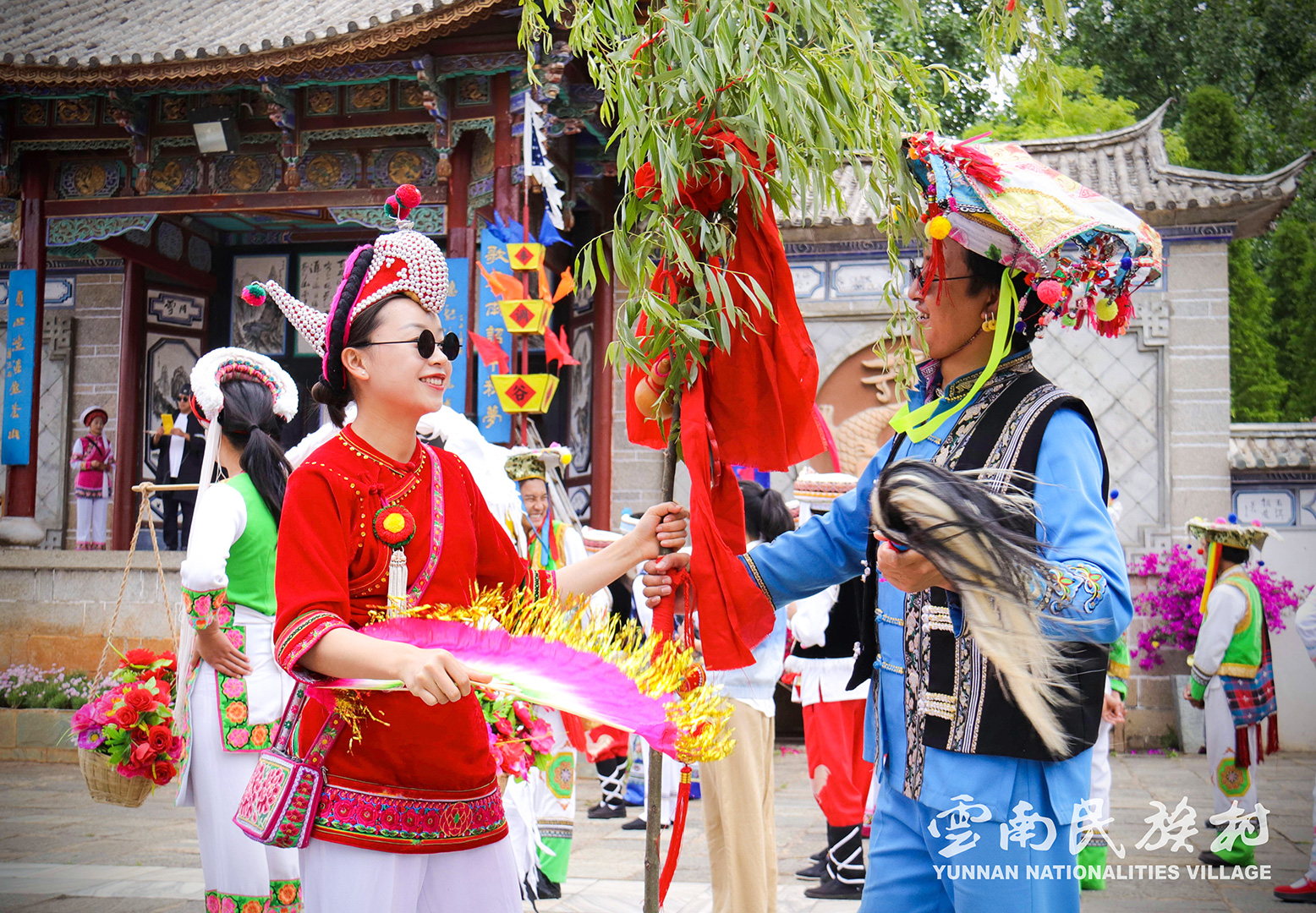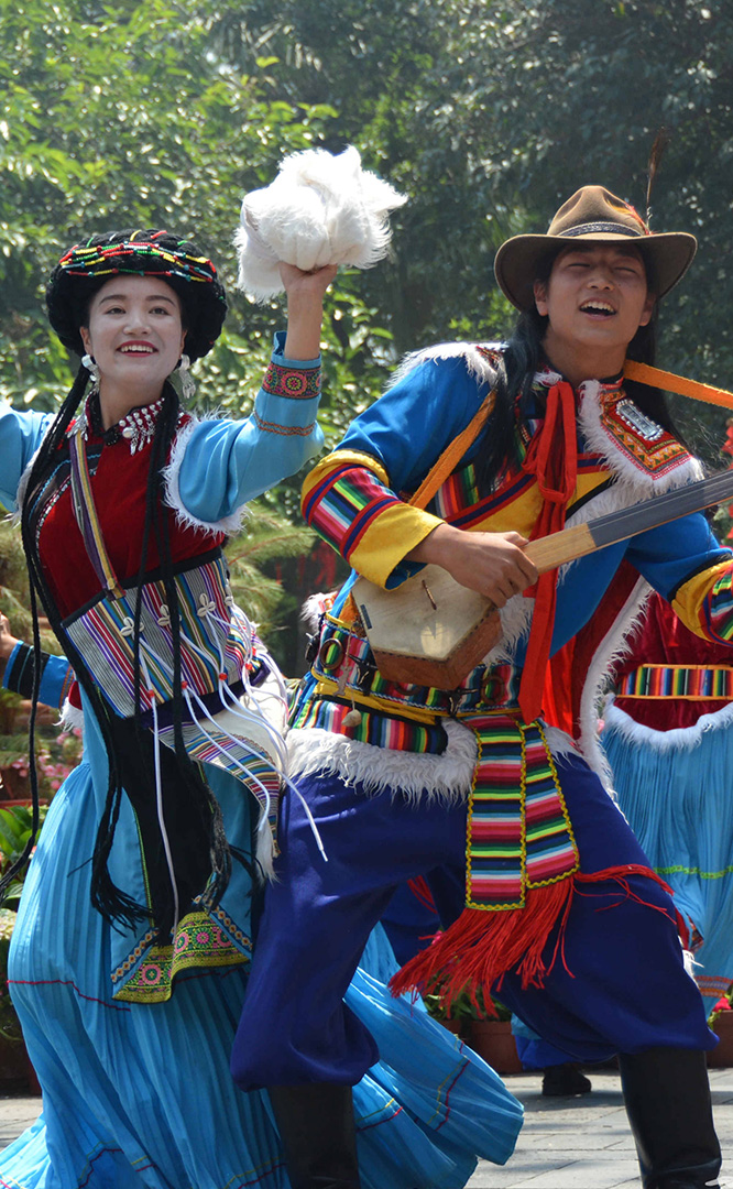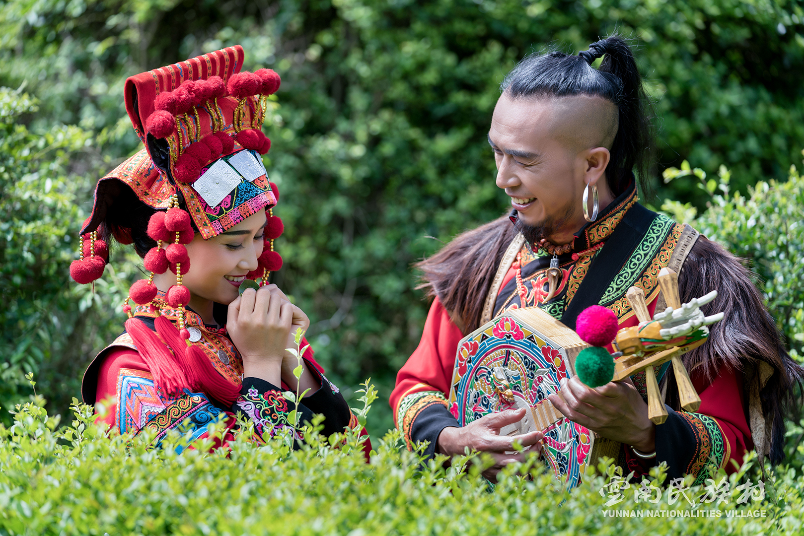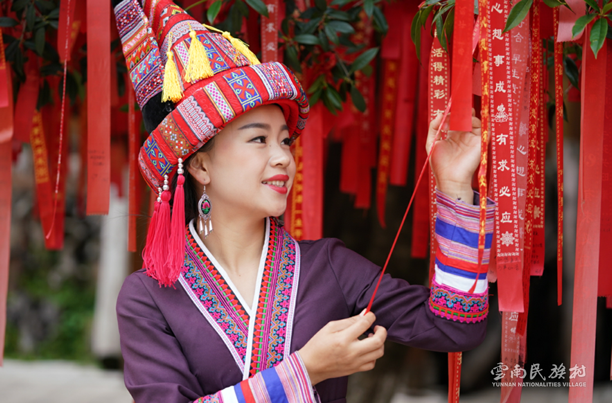 彝族在云南境內(nèi)約471萬(wàn)人,是省內(nèi)人口最多、分布最廣的少數(shù)民族,主要聚居在金沙江、元江流域和哀牢山、無(wú)量山腹地。彝族是一個(gè)能歌善舞的民族,民間打歌、跳樂(lè)之風(fēng)盛行,大三弦、跌腳舞久負(fù)盛名。火把節(jié)是彝族最具特色的民族節(jié)日。彝族村占地50余畝,三虎浮雕墻與虎頭內(nèi)祖師形象表現(xiàn)了彝族虎鷹文化。太陽(yáng)歷廣場(chǎng)圖騰柱上有太陽(yáng)、虎、火和八卦圖形象,周?chē)h(huán)繞著10個(gè)朝向不同的月球造型,外圓周有12生肖石雕。依山而建的“...